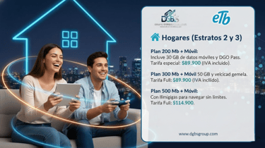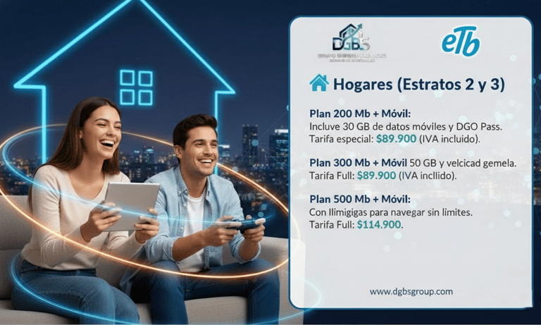 En DGBS Group Empresarial, actuamos como el aliado estratégico y canal digital autorizado de ETB para Bogotá y sus alrededores. Nos especializamos en conectar a las personas y empresas con la tecnología de conectividad más avanzada de Colombia.