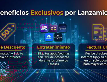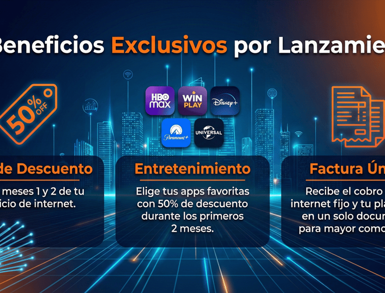 Entretenimiento: Elige tus apps favoritas (HBO Max, Win Play, Disney+, Paramount+, Universal+) con 50% de descuento durante los primeros 2 meses.